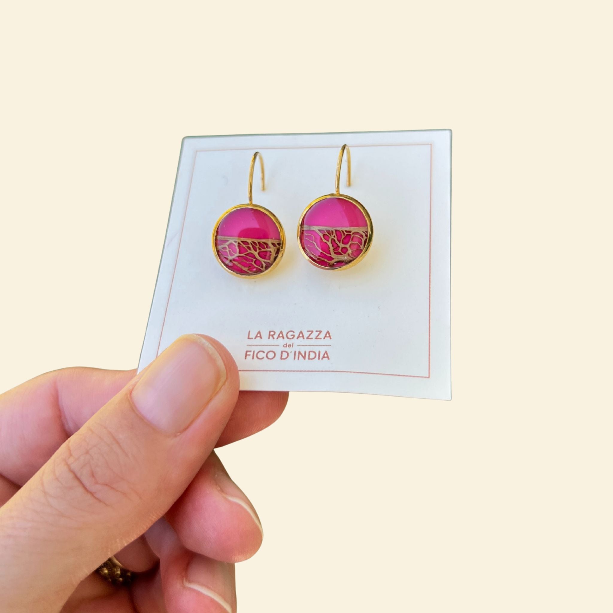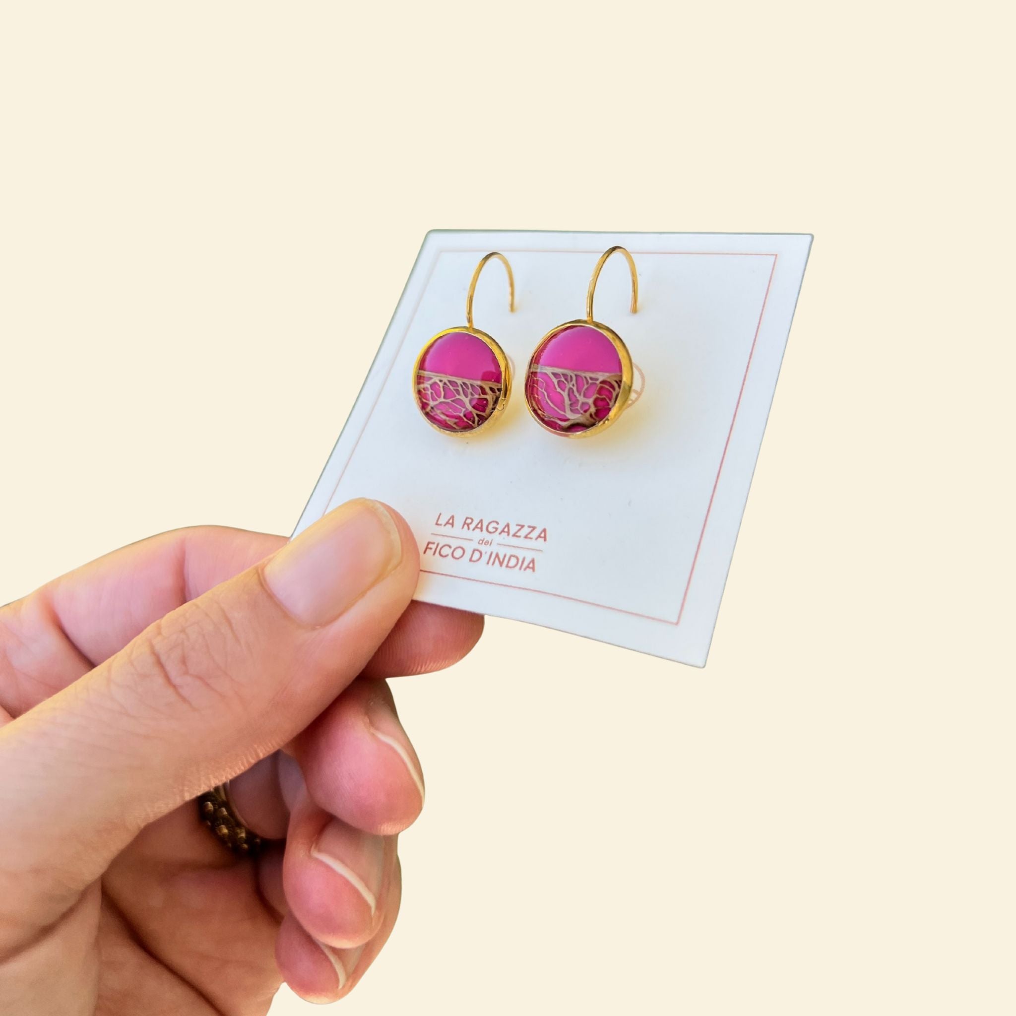 Orecchini a monachella con fibra di fico d'india sotto resina e sfondo fucsia .