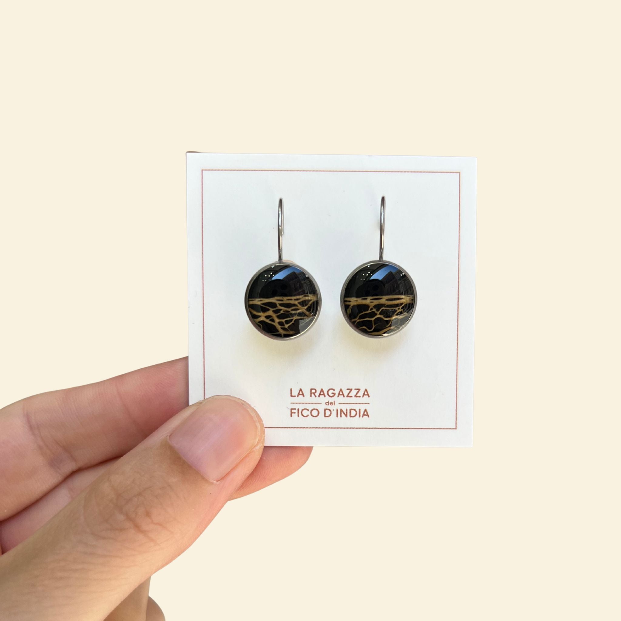 Orecchini a monachella con fibra di fico d'india sotto resina e sfondo nero.